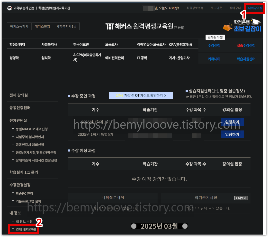 나는 환불을 아무렇지 않게 할 수 있는 성향은 아니다. 그래도 어쩔수 없이 환불을 해야 했고 처음 하는 환불이라 어떻게 해야 할지 몰라 해커스 쪽에 전화를 걸어 의도치 않게 초등학교 방학 돌봄을 하게 되어 실습을 좀 미뤄야 할 것 같다고 잘 설명을 했다. 다행히 친절하게 해커스 홈페이지에서 환불을 할 수 있는 방법을 알려주었다. 100% 환불의 기준은 개강 전일까지 환불신청을 하면 된다고 했다. 급할때 확실히 잘 보이지 않나 보다. 홈페이지를 살펴봤는데도 환불할 수 있는 부분을 찾지를 못했다. 이렇게 시스템이 잘 되어있는데 말이다. 이 과정이 필요할지 모르지만 과정을 남겨두겠다.