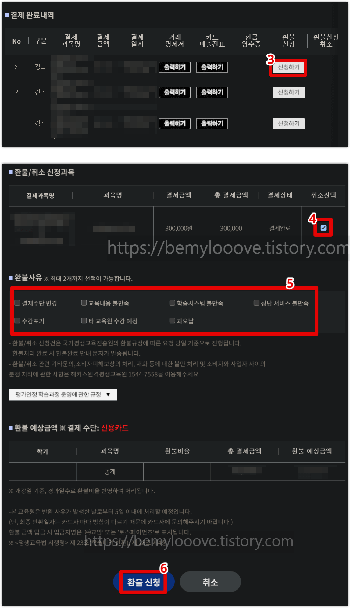 (3) 결제 완료내역이 나오는데 환불을 받고 싶은 과목에 '신청하기' 버튼을 클릭하면 다른 페이지로 넘어간다.